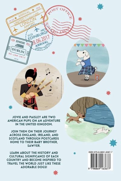 Two American dogs - Jovie and Paisley set off on an adventure to the United Kingdom and Ireland! Along their travels, they write postcards home to their little brother, Sawer. This funny and wholesome story provides education about famous people and places across England, Ireland, and Scotland that will surely inspire your young reader.