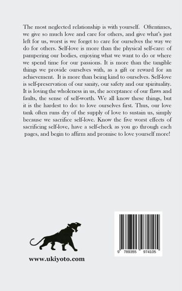 The most neglected relationship is with yourself. Oftentimes, we give so much love and care for others, and give what's just left for us, worst is we forget to care for ourselves the way we do for others. Self-love is more than the physical self-care: of pampering our bodies, enjoying what we want to do or where we spend time for our passions. It is more than the tangible things we provide ourselves with, as a gift or reward for an achievement. It is more than being kind to ourselves. Self-love is self-preservation of our sanity, our safety and our spirituality. It is loving the wholeness in us, the acceptance of our flaws and faults, the sense of self-worth. We all know these things, but it is the hardest to do: to love ourselves first. Thus, our love tank often runs dry of the supply of love to sustain us, simply because we sacrifice self-love. Know the five worst effects of sacrificing self-love, have a self-check as you go through each pages, and begin to affirm and promise to love yourself more!