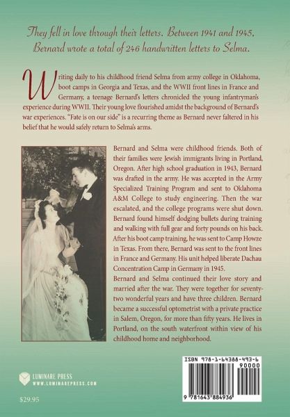 They fell in love through their letters. Between 1941 and 1945, Bernard wrote a total of 246 handwritten letters to Selma. Writing daily to his childhood friend Selma from army college in Oklahoma, boot camps in Georgia and Texas, and the WWII front lines in France and Germany, a teenage Bernard's letters chronicled the young infantryman's experience during WWII. Their young love flourished amidst the background of Bernard's war experiences. "Fate is on our side" is a recurring theme as Bernard never faltered in his belief that he would safely return to Selma's arms. Proceeds from the sale of this book will be donated to the Ronald McDonald House at the Rood Family Pavilion in Portland, Oregon.