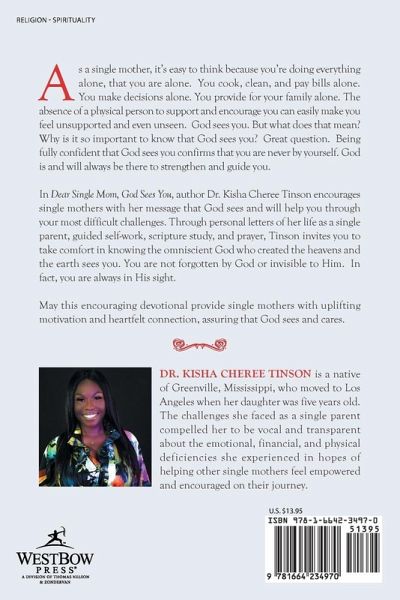As a single mother, it's easy to think because you're doing everything alone, that you are alone. You cook, clean, and pay bills alone. You make decisions alone. You provide for your family alone. The absence of a physical person to support and encourage you can easily make you feel unsupported and even unseen. God sees you. But what does that mean? Why is it so important to know that God sees you? Great question. Being fully confident that God sees you confirms that you are never by yourself. God is and will always be there to strengthen and guide you. In Dear Single Mom, God Sees You, author Dr. Kisha Cheree Tinson encourages single mothers with her message that God sees and will help you through your most difficult challenges. Through personal letters of her life as a single parent, guided self-work, scripture study, and prayer, Tinson invites you to take comfort in knowing the omniscient God who created the heavens and the earth sees you. You are not forgotten by God or invisible to Him. In fact, you are always in His sight. May this encouraging devotional provide single mothers with uplifting motivation and heartfelt connection, assuring that God sees and cares.