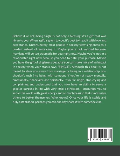 Believe it or not, being single is not only a blessing, it's a gift that was given to you. When a gift is given to you, it's best to treat it with love and acceptance. Unfortunately most people in society view singleness as a burden instead of embracing it. Maybe you're not married because marriage will be too traumatic for you right now. Maybe you're not in a relationship right now because you need to fulfill your purpose. Maybe you have the gift of singleness because you can make more of an impact in society when your status says "SINGLE". Although this book is not meant to steer you away from marriage or being in a relationship, you shouldn't rush into being with someone if you're not ready mentally, emotionally, financially, and spiritually. If you're single, stop crying and complaining and understand that you now have an ability to serve a greater purpose in life with very little distraction. I encourage you to serve this world with great energy and so much passion that it motivates others to better themselves. Who knows? Once your life is stable and fully established, perhaps you can one day share it with someone else.