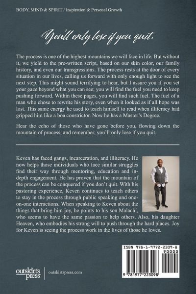 The process is one of the highest mountains we will face in life. But without it, we yield to the pre-written script, based on our skin color, our family history, and even our transgressions. The process rests at the door of every situation in our lives, calling us forward with only enough light to see the next step. This might sound terrifying to hear, but I assure you if you set your gaze beyond what you can see; you will find the fuel you need to keep pushing forward. Within these pages, you will find such fuel. The fuel of a man who chose to rewrite his story, even when it looked as if all hope was lost. This same energy he used to teach himself to read when illiteracy had gripped him like a boa constrictor. Now he has a Master's Degree. Hear the echo of those who have gone before you, flowing down the mountain of process, and remember, you'll only lose if you quit.