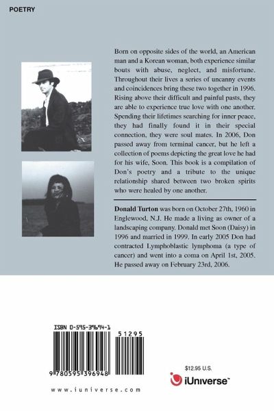 Born on opposite sides of the world, an American man and a Korean woman, both experience similar bouts with abuse, neglect, and misfortune. Throughout their lives a series of uncanny events and coincidences bring these two together in 1996. Rising above their difficult and painful pasts, they are able to experience true love with one another. Spending their lifetimes searching for inner peace, they had finally found it in their special connection, they were soul mates. In 2006, Don passed away from terminal cancer, but he left a collection of poems depicting the great love he had for his wife, Soon. This book is a compilation of Don's poetry and a tribute to the unique relationship shared between two broken spirits who were healed by one another.