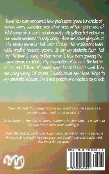 College is much too serious to be taken seriously. Dear Student is a guide on how to avoid taking Higher Education too seriously. A collection of tweet-sized snarks about student papers, emails, and pleas. A great book to keep in your purse, pocket or bathroom because you don't have to remember any plot, characters, or worry about what will happen next. Keep it handy for when you need an emergency giggle or two. Sticklers, grammandos, grammar police, and anyone who has ever graded a paper or cringed at a poorly written email will enjoy this book.