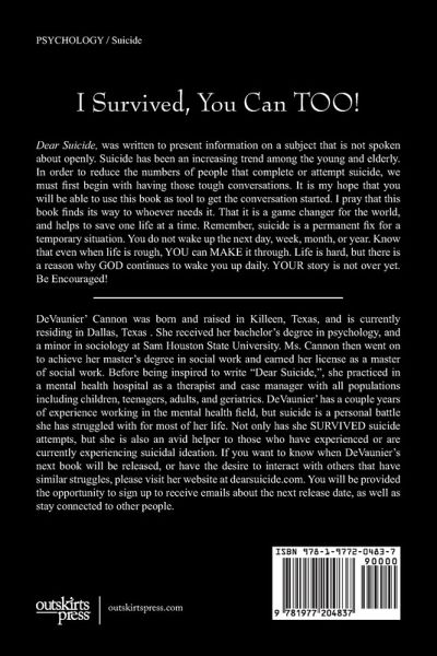 Dear Suicide, was written to present information on a subject that is not spoken about openly. Suicide has been an increasing trend among the young and elderly. In order to reduce the numbers of people that complete or attempt suicide, we must first begin with having those tough conversations. It is my hope that you will be able to use this book as tool to get the conversation started. I pray that this book finds its way to whoever needs it. That it is a game changer for the world, and helps to save one life at a time. Remember, suicide is a permanent fix for a temporary situation. You do not wake up the next day, week, month, or year. Know that even when life is rough, YOU can MAKE it through. Life is hard, but there is a reason why GOD continues to wake you up daily. YOUR story is not over yet. Be Encouraged!