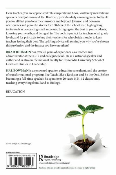 Dear teacher, you are appreciated! This inspirational book, written by motivational speakers Brad Johnson and Hal Bowman, provides daily encouragement to thank you for all that you do in the classroom and beyond. Johnson and Bowman offer quotes and powerful stories for 100 days of the school year, highlighting topics such as celebrating small successes, bringing out the best in your students, knowing your worth, and being all in. The book is perfect for teachers of all grade levels, and for principals to buy their teachers for schoolwide morale, to keep teachers feeling their best. The uplifting advice will remind you why you've chosen this profession and the impact you have on others!