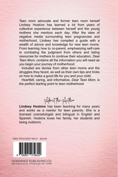 About the Book Teen mom advocate and former teen mom herself Lindsey Hoskins has learned a lot from years of collective experience between herself and the young mothers she mentors each day. After the slew of negative media surrounding teen pregnancies and motherhood, Lindsey has compiled a guide with a wealth of advice and knowledge for new teen moms. From learning how to co-parent, emphasizing self-care to combating the judgment from others and listing resources for mothers to continue their education, Dear Teen Mom, contains all the information you will need as you begin your journey of motherhood. Included are stories from other teen moms and the struggles they faced, as well as their own tips and tricks on how to make a good life for you and your child. Heartfelt, caring, and informative, Dear Teen Mom, is the perfect starting point to teen motherhood. About the Author Lindsey Hoskins has been teaching for many years and works as a mentor for teen parents. She is a licensed cosmetologist and bilingual in English and Spanish. Hoskins loves her family, her students and being outdoors.