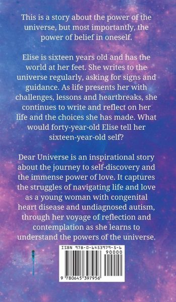 This is a story about the power of the universe, but most importantly, the power of belief in oneself. Elise is sixteen years old and has the world at her feet. She writes to the universe regularly, asking for signs and guidance. As life presents her with challenges, lessons and heartbreaks, she continues to write and reflect on her life and the choices she has made. What would forty-year-old Elise tell her sixteen-year-old self? Dear Universe is an inspirational story about the journey to self-discovery and the immense power of love. It captures the struggles of navigating life and love as a young woman with congenital heart disease and undiagnosed autism, through her voyage of reflection and contemplation as she learns to understand the powers of the universe.