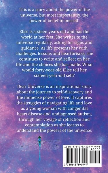 This is a story about the power of the universe, but most importantly, the power of belief in oneself. Elise is sixteen years old and has the world at her feet. She writes to the universe regularly, asking for signs and guidance. As life presents her with challenges, lessons and heartbreaks, she continues to write and reflect on her life and the choices she has made. What would forty-year-old Elise tell her sixteen-year-old self? Dear Universe is an inspirational story about the journey to self-discovery and the immense power of love. It captures the struggles of navigating life and love as a young woman with congenital heart disease and undiagnosed autism, through her voyage of reflection and contemplation as she learns to understand the powers of the universe.