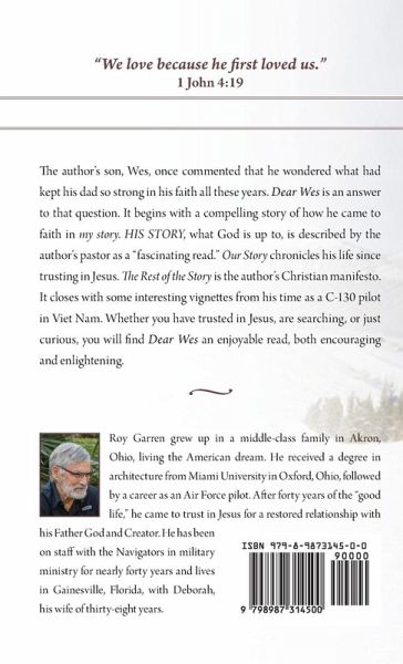 The author's son, Wes, once commented that he wondered what had kept his dad so strong in his faith all these years. Dear Wes is an answer to that question. It begins with a compelling story of how he came to faith in my story. HIS STORY, what God is up to, is described by the author's pastor as a "fascinating read." Our Story chronicles his life since trusting in Jesus. The Rest of the Story is the author's Christian manifesto. It closes with some interesting vignettes from his time as a C-130 pilot in Viet Nam. Whether you have trusted in Jesus, are searching, or just curious, you will find Dear Wes an enjoyable read, both encouraging and enlightening.