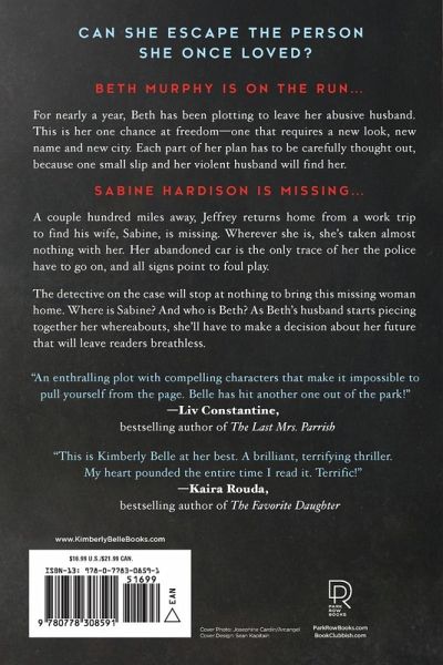 From the bestselling author of The Marriage Lie comes a riveting new novel of suspense about a woman who must decide just how far she'll go to escape the person she once loved Beth Murphy is on the run… For nearly a year, Beth has been planning for her escape. She's thought through everything -- a new look, new name and new city -- because one small slip and her husband will find her. Sabine Hardison is missing… A couple hundred miles away, Jeffrey returns home from a work trip to find his wife, Sabine, is missing. Wherever she is, she's taken almost nothing with her. Her abandoned car is the only evidence the police have, and all signs point to foul play. As the police search for leads, the case becomes more and more convoluted. Sabine's carefully laid plans for her future indicate trouble at home, and a husband who would be better off with her gone. But are things really as clear cut as they seem? Where is Sabine? And who is Beth? The only thing that's certain is that someone is lying and the truth won't stay buried for long. Don't miss bestselling author Kimberly Belle's next deeply addictive thriller, The Personal Assistant-where she explores the dark side of the digital world when a mommy-blogger's assistant goes missing! Look for these other pulse-pounding thrillers by Kimberly Belle: * The Marriage Lie * The Last Breath * Stranger in the Lake * My Darling Husband * Three Days Missing * The Ones We Trust
