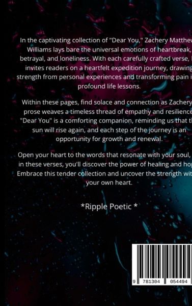 In the captivating collection of "Dear You," Zachery Matthews Williams lays bare the universal emotions of heartbreak, betrayal, and loneliness. With each carefully crafted verse, he invites readers on a heartfelt expedition journey, drawing strength from personal experiences and transforming pain into profound life lessons. Within these pages, find solace and connection as Zachery's prose weaves a timeless thread of empathy and resilience. "Dear You" is a comforting companion, reminding us that the sun will rise again, and each step of the journey is an opportunity for growth and renewal. Open your heart to the words that resonate with your soul, for in these verses, you'll discover the power of healing and hope. Embrace this tender collection and uncover the strength within your own heart.