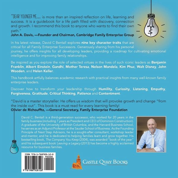 Most business leaders eventually discover that their education, leadership skills and years of hard work do little to prepare them for leading through the realities of a family business and the critical challenges encountered, that if not harnessed, can tear a family business apart. After a great amount of study and reflection, David Bentall came to see that he was ill equipped to be a part of the solution for his own family business because he lacked many of the qualities needed if he was going to make a positive contribution, so he set out to identify the changes he needed. In Dear Younger Me David explores the nine most important character traits that he wished he had been wise enough to develop when he was a young executive. These traits present practical guidance and advice for cultivating emotional intelligence and personal character, and transforming leadership through HUMILITY, CURIOSITY, LISTENING, EMPATHY, FORGIVENESS, GRATITUDE, CRITICAL THINKING, PATIENCE and CONTENTMENT. David believes that each trait is necessary for successors to develop the skills and relationships required to successfully lead any family enterprise.