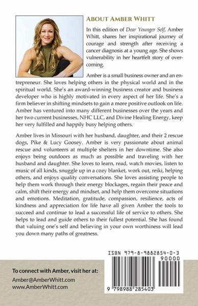 Dear Younger Self is an inspirational book full of healing, success, growth, overcoming challenges, and offering support. Amber Whitt shares her inspirational journey of courage and strength after receiving a cancer diagnosis at the age of 32 with a new baby and a new small business. She shows vulnerability in her heartfelt story of overcoming, while offering love and support to everyone.