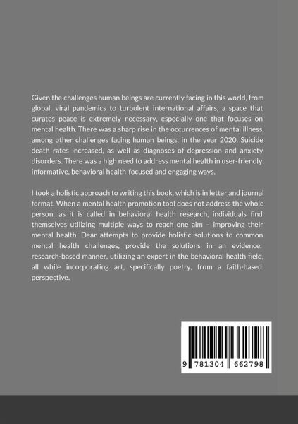 I am a social worker and public health professional by day, and a writer by night. This book is a safe space for those of us who have experienced anxiety and depression and want a place to breathe, relax, and release the stress associated with both. The tagline is "anxiety and depression relief in verse," meaning a majority of the content is poetry.