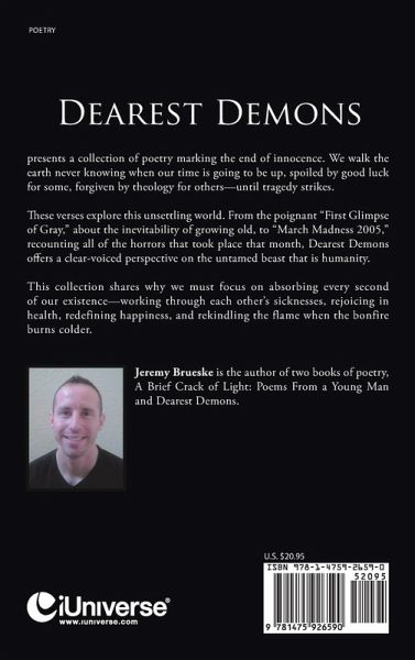 Dearest Demons presents a collection of poetry marking the end of innocence. We walk the earth never knowing when our time is going to be up, spoiled by good luck for some, forgiven by theology for others-until tragedy strikes. These verses explore this unsettling world. From the poignant "First Glimpse of Gray," about the inevitability of growing old, to "March Madness 2005," recounting all of the horrors that took place that month, Dearest Demons offers a clear-voiced perspective on the untamed beast that is humanity. This collection shares why we must focus on absorbing every second of our existence-working through each other's sicknesses, rejoicing in health, redefining happiness, and rekindling the flame when the bonfire gets colder.