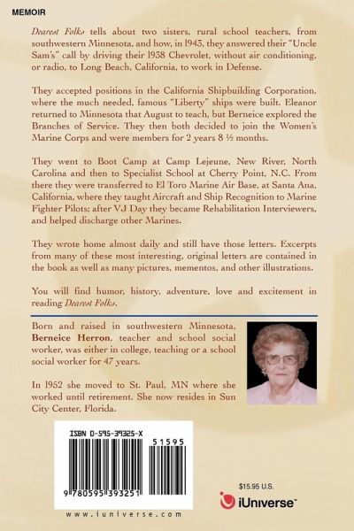 Dearest Folks tells about two sisters, rural school teachers, from southwestern Minnesota, and how, in l943, they answered their "Uncle Sam's" call by driving their l938 Chevrolet, without air conditioning, or radio, to Long Beach, California, to work in Defense. They accepted positions in the California Shipbuilding Corporation, where the much needed, famous "Liberty" ships were built. Eleanor returned to Minnesota that August to teach, but Berneice explored the Branches of Service. They then both decided to join the Women's Marine Corps and were members for 2 years 8 ¿ months. They went to Boot Camp at Camp Lejeune, New River, North Carolina and then to Specialist School at Cherry Point, N.C. From there they were transferred to El Toro Marine Air Base, at Santa Ana, California, where they taught Aircraft and Ship Recognition to Marine Fighter Pilots; after VJ Day the became Rehabilitation Interviewers, and helped discharge other Marines. They wrote home almost daily and still have those letters. Excerpts from many of these most interesting, original letters are contained in the book as well as many pictures, mementos, and other illustrations. You will find humor, history, adventure, love and excitement in reading Dearest Folks.