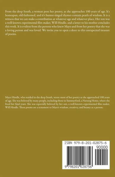 From the deep South, a woman pens her poetry, as she approaches 100 years of age. It's homespun, old-fashioned, and it's humor-tinged rhymes contain pearls of wisdom. It is a witness that we can make a contribution at whatever age and whatever place. Her son was a well-known experimental film maker, Will Hindle, and a letter to his mother concludes this work. It is evident from the persons who knew Mayo and from her poetry that she was a loving person and was loved. We invite you to open a door to this unexpected treasure of poems.