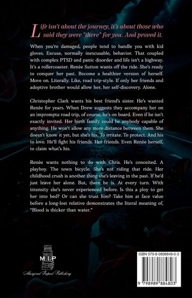 Life isn't about the journey; it's about who said they were "there" for you. And proved it. When you're damaged, people tend to handle you with kid gloves. Excuse, normally inexcusable, behavior. That, coupled with complex PTSD and panic disorder, and life isn't a highway. It's a rollercoaster. Renée Sutton wants off the ride. She's ready to conquer her past. Become a healthier version of herself. Move on. Literally. Like, road trip-style. If only her friends and adoptive brother would allow her, her self-discovery. Alone. Christopher Clark wants his best friend's sister. He's wanted Renée for years. When Drew suggests they accompany her on an impromptu road trip, of course, he's on board. Even if he isn't exactly invited. Her birth family could be anybody capable of anything. He won't allow any more distance between them. She doesn't know it yet, but she's his. To irritate. To protect. And his to love. He'll fight his friends. Her friends. Even Renée herself, to claim what's his. Renée wants nothing to do with Chris. He's conceited. A playboy. The town bicycle. She's not riding that ride. Her childhood crush is another thing she's leaving in the past-if he'd just leave her alone. But, there he is. At every turn. With intensity she's never experienced before. Is this a ploy to get her into bed? Or can she trust him? Take him at face value before a long-lost relative demonstrates the literal meaning of, "Blood is thicker than water."
