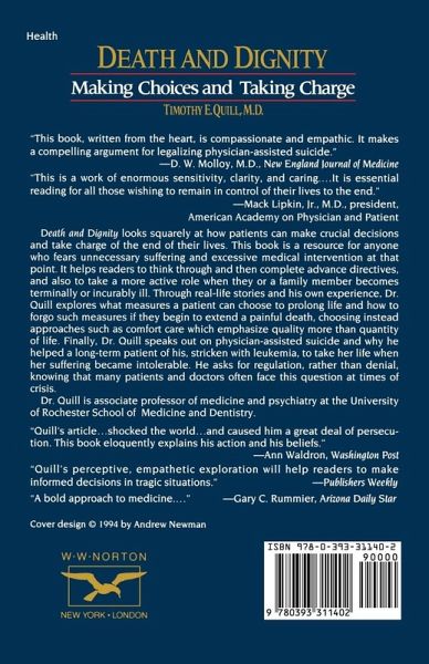 This book looks squarely at how patients can make crucial decisions and take charge of the end of their lives. This book is a resource for anyone who fears unnecessary suffering and excessive medical intervention at that point. It helps readers think through and then complete advance directives, and also to take a more active role when they or a family member becomes terminally ill. Through real-life stories and his own experience, Dr. Quill explores what measures a patient can choose to prolong life and how to forgo such measures if they begin to extend a painful death, choosing instead approaches such as comfort care which emphasize quality more than quantity of life. Finally, Dr. Quill speaks out on physician-assisted suicide and why he helped a long-term patient of his, stricken with leukemia, to take her life when her suffering became intolerable. He asks for regulation, rather than denial, knowing that many patients and doctors ofen face this question at times of crisis.