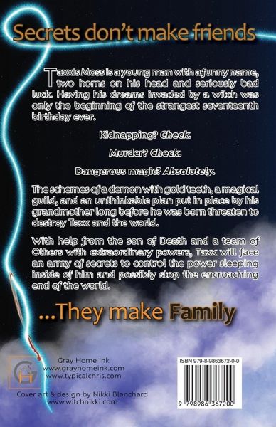 Taxxis Moss is a young man with a funny name, two horns on his head, and seriously bad luck. Having his dreams invaded by a witch was only the beginning of the strangest seventeenth birthday ever. Kidnapping? Check. Murder? Check. Dangerous magic? Absolutely. The schemes of a demon with gold teeth, a magical guild, and an unthinkable plan put in place by his grandmother long before he was born threaten to destroy Taxx and the world. With help from the son of Death and a team of Others with extraordinary powers, Taxx will face an army of secrets to control the power sleeping inside of him and possibly stop the encroaching end of the world. Secrets don't make friends. They make Family.