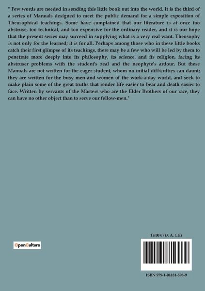 " Few words are needed in sending this little book out into the world. It is the third of a series of Manuals designed to meet the public demand for a simple exposition of Theosophical teachings. Some have complained that our literature is at once too abstruse, too technical, and too expensive for the ordinary reader, and it is our hope that the present series may succeed in supplying what is a very real want. Theosophy is not only for the learned; it is for all. Perhaps among those who in these little books catch their first glimpse of its teachings, there may be a few who will be led by them to penetrate more deeply into its philosophy, its science, and its religion, facing its abstruser problems with the student's zeal and the neophyte's ardour. But these Manuals are not written for the eager student, whom no initial difficulties can daunt; they are written for the busy men and women of the work-a-day world, and seek to make plain some of the great truths that render life easier to bear and death easier to face. Written by servants of the Masters who are the Elder Brothers of our race, they can have no other object than to serve our fellow-men."