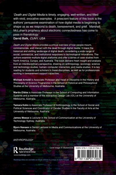 Death and Digital Media provides a critical overview of how people mourn, commemorate and interact with the dead through digital media. It maps the historical and shifting landscape of digital death, considering a wide range of social, commercial and institutional responses to technological innovations. The authors examine multiple digital platforms and offer a series of case studies drawn from North America, Europe and Australia. The book delivers fresh insight and analysis from an interdisciplinary perspective, drawing on anthropology, sociology, science and technology studies, human-computer interaction, and media studies. It is key reading for students and scholars in these disciplines, as well as for professionals working in bereavement support capacities.