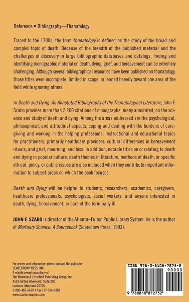 While it can be traced to the 1700s, the term thanatology has gained traction in recent decades to refer to the study of death. Because of the breadth of the published material and the challenges of discovery in large bibliographic databases and catalogs, finding and identifying monographic material on death, dying, grief, and bereavement can be extremely challenging. Although there have been several bibliographical resources published on thanatology, those titles were incomplete, limited in scope, or leaned heavily toward one area of the field. In Death and Dying: An Annotated Bibliography of the Thanatological Literature, John F. Szabo provides more than 2,200 citations of monographs on the science and study of death and dying. Among the areas this volume addresses are the psychological, philosophical, and attitudinal aspects; coping and dealing with the burdens of caregiving and working in the helping professions; instructional and educational topics for practitioners, primarily health care providers; cultural differences in bereavement rituals; and grief, mourning, and loss. In addition, notable titles on or relating to death and dying in popular culture, death themes in literature, methods of death, or specific ethical, policy, or public issues are also included when they contribute important information to subject areas on which the book focuses. This book will be helpful to students, researchers, academics, caregivers, health care professionals, psychologists, social workers, and anyone with an interest in death, dying, bereavement, or the care of the terminally ill.