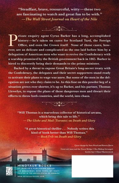 In 1894, Cyrus Barker, London's premier enquiry agent, is entangled in a conspiracy to revive the American Civil War by prominent figures, long believed deceased. Private Enquiry agent Cyrus Barker, along with his partner Thomas Llewelyn, has a long, accomplished history - he's taken on cases for Scotland Yard, the Foreign Office, and even the crown itself, fulfilling them all with great skill and discretion. None of those cases, however, are as delicate and complicated as the one laid before him by a delegation of men who, thirty years before, fought for the Confederacy during the American Civil War. These men want to revive the Confederacy with a warship promised to the Rebels from the British Government in 1865. To get it now, they're threatening to reveal the long-secret treaty with the Confederacy. Barker is hired to use his connections to discreetly bring their threats to the Prime Minister. With a web of prominent, if secret, supporters throughout England ready to through their support to their efforts to wage war anew on the United States, the delegates are just waiting for the warship to begin their plans. But some of the men are not who they claim to be, and the American government has their own team watching, and waiting, for the right moment to take action. As this fuse on this powder keg of a situation grows ever shorter, it's up to Barker & Llewelyn to uncover the real identities and plans of these dangerous men.