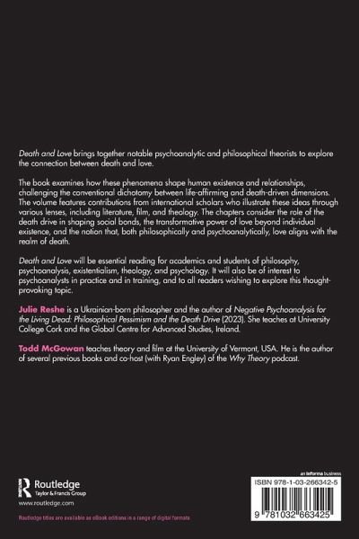 The book examines how these phenomena shape human existence and relationships, challenging the conventional dichotomy between life-affirming and death-driven dimensions. The volume features contributions from international scholars who illustrate these ideas through various lenses, including literature, film, and theology. The chapters consider the role of the death drive in shaping social bonds, the transformative power of love beyond individual existence, and the notion that, both philosophically and psychoanalytically, love aligns with the realm of death.