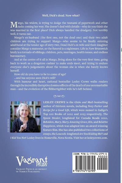 Well, Dick's dead. Now what? Margo, his widow, is trying to dodge the tsunami of paperwork and other tasks coming her way. She doesn't deal with details-why do you think she was married in the first place? Dick always handled the drudgery. Not terribly well, it turns out. Margo's ex-husband (the first one, not the dead one) and their two adult children are trying to support Margo-who seems to be finally entering adulthood at the tender age of sixty-two. Dead Dick's ex-wife and their daughter consider Margo a maneater, so the funeral is a nightmare. Life in New Brunswick lately is a tornado of siblings, children, pets, marriages, health issues, and endless bureaucracy. And at the centre of it all is Margo, living alone for the very first time, going back to work as a drugstore cashier to make ends meet, and trying to endure everyone else's judgements about the woman she is when she barely knows herself. How old do you have to be to come of age?...and has anyone seen Dick's will? With humour and heart, national bestseller Lesley Crewe walks readers through the incredibly disruptive domino effects of the death of one unremarkable man-and the evolution of the flibbertigibbet wife he's left behind.