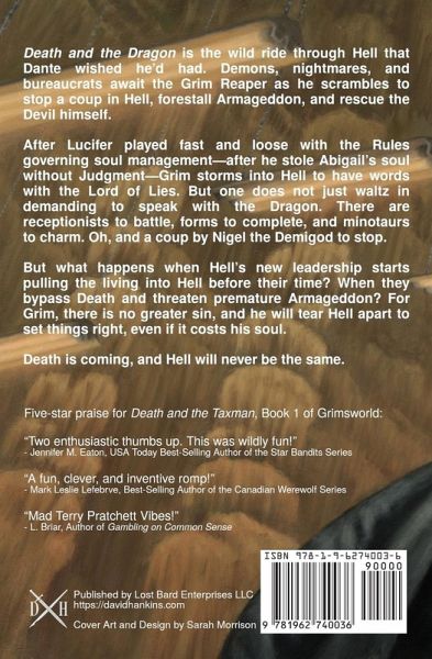 Sequel to the award-winning IAN Humor Book of the Year Death and the Taxman. Death and the Dragon is the wild ride through Hell that Dante wished he'd had. Demons, nightmares, and bureaucrats await the Grim Reaper as he scrambles to stop a coup in Hell, forestall Armageddon, and rescue the Devil himself. After Lucifer played fast and loose with the Rules governing soul management-after he stole Abigail's soul without Judgment-Grim storms into Hell to have words with the Lord of Lies. But one does not just waltz in demanding to speak with the Dragon. There are receptionists to battle, forms to complete, and minotaurs to charm. Oh, and a coup by Nigel the Demigod to stop. But what happens when Hell's new leadership starts pulling the living into Hell before their time? When they bypass Death and threaten premature Armageddon? For Grim, there is no greater sin, and he will tear Hell apart to set things right, even if it costs his soul. Death is coming, and Hell will never be the same. Written in the lighthearted styles of Sir Terry Pratchett and Douglas Adams, Death and the Dragon is a humorous contemporary fantasy about friendship, family, and fighting against all odds for what's right. Death and the Dragon is the sequel to Death and the Taxman, which readers and critics alike called "wildly fun," "laugh-out-loud funny," and "absolutely hilarious!"