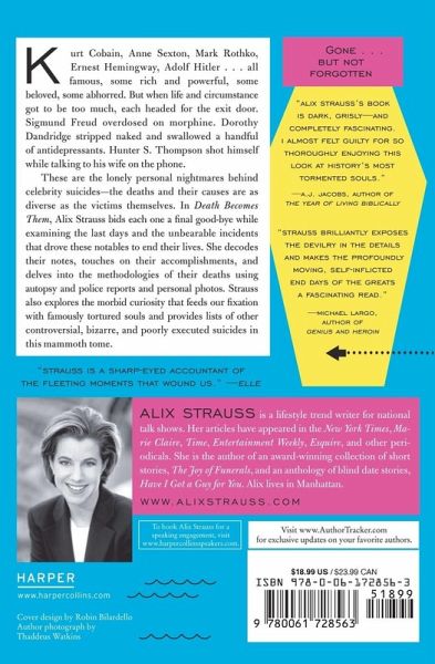 "Death Becomes Them" takes a provocative cultural and historical look at the icons who have committed suicide, from Virginia Woolf to Kurt Cobain.Author Alix Strauss takes a provocative look at the self-imposed deaths of the famous and infamous in Death Becomes Them. In this fascinating and intimate chronicle of celebrity suicides, the spotlight shines on the lonely last moments of Kurt Cobain and Ernest Hemingway, Abbie Hoffman and Adolf Hitler, Dorothy Dandridge, Sigmund Freud, Hunter S. Thompson, and others. Death Becomes Them explores their sadness and madness, their accomplishments and the circumstances that led to their irreversible decision, and wishes them all a fond final good-bye.