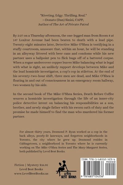 ¿By 2:27 on a Thursday afternoon, the one-legged man from Room 8 at 147 Loxitor Avenue had been beaten to death with a lead pipe. Twenty-eight minutes later, Detective Mike O'Shea is testifying in a stuffy courtroom, unaware that, within an hour, he will be standing in an alleyway littered with beer cans and condoms while his new partner uses a ballpoint pen to flick bugs off of a battered corpse. When a rogue undercover copper leaves Mike balancing what is legal with what is right, an unlikely rapport develops between Mike and the lead homicide investigator, a cop's cop in stilettos. At the end of his seventy-two-hour shift, three men are dead, and Mike O'Shea is floating in and out of consciousness in an emergency room hallway, two women by his side. In the second book of The Mike O'Shea Series, Death Before Coffee weaves a homicide investigation through the life of an inner-city police detective intent on balancing his responsibilities as a son, brother, and newly single father with his sworn oath of duty and the promise he made himself to find the man who murdered his former partner.