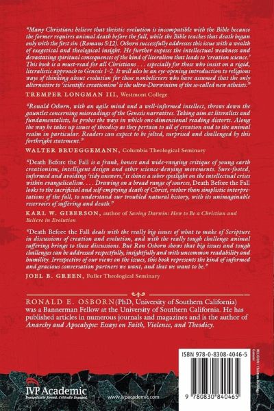 ECPA Top Shelf Book Cover Award Did animals have predatory natures before the fall? Did God punish innocent animals with a curse because of human sin? Is it possible for theistic evolution to be compatible with the Bible, even though animal death before the fall would contradict the teaching that death began after the first sin? In this eloquent and provocative "open letter" to evangelicals, Ronald Osborn wrestles with these pointed questions and with the problem of biblical literalism and animal suffering within an evolutionary understanding of the world. Considering the topic of animal suffering and predation as a theodicy dilemma, Osborn offers an open-minded exploration of the subject, specifically coming against the fundamentalist and literalist view of the book of Genesis and the creation account. He challenges one-dimensional reading of Scripture and shines a sobering light on the evangelical dogma responsible for advancing viewpoints long ago dismantled by science. Always acknowledging the traditionalist viewpoint, Osborn demonstrates with a wealth of exegetical and theological insight how orthodox Christianity can embrace evolutionary concepts without contradiction. Osborn forces us to ask hard questions, not only of the Bible and church tradition, but also and especially of ourselves.