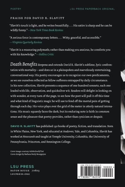 Death Benefits deepens and extends David R. Slavitt's sublime, lyric confrontation with mortality--and does so in a plainspoken and marvelously entertaining, conversational way. His poetry encourages us to recognize our own predicaments, as we see ourselves reflected as fellow sufferers entrapped by daily circumstance. In his new collection, Slavitt presents a sequence of one hundred sonnets, each one loaded with life, observation, and quicksilver wit. Readers will delight in looking on with wonder, at every turn of the page, to see how the poet will pull it off this time and what kind of linguistic magic he will use to fend off the mortal pain of getting through each day. His voice plays over the grid of the meter in utterly natural intonations. His music squarely faces the dark, but its enduring note is faith in common sense and the pleasure that poetry provides, rather than cynicism or despair.