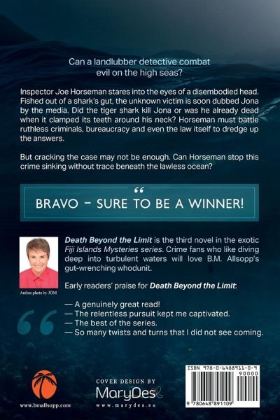 Can a landlubber detective combat evil on the high seas? Inspector Joe Horseman stares into the eyes of a severed head. Fished out of a shark's gut, the unknown victim is soon dubbed Jona by the media. Did the tiger shark kill Jona or was he already dead when it clamped its teeth around his neck? Horseman must battle ruthless criminals, bureaucracy and even the law itself to dredge up the answers. But cracking the case may not be enough. Can Horseman stop this crime sinking without trace in the lawless ocean? ¿Death Beyond the Limit is the third novel in the exotic Fiji Islands Mysteries series. Crime fans who like diving deep into turbulent waters will love B.M. Allsopp's gut-wrenching whodunit. Advance readers' praise for Death Beyond the Limit "A genuinely great read!" "The relentless pursuit kept me captivated." "The best of the series." "So many twists and turns that I did not see coming." "Sure to be a winner!"