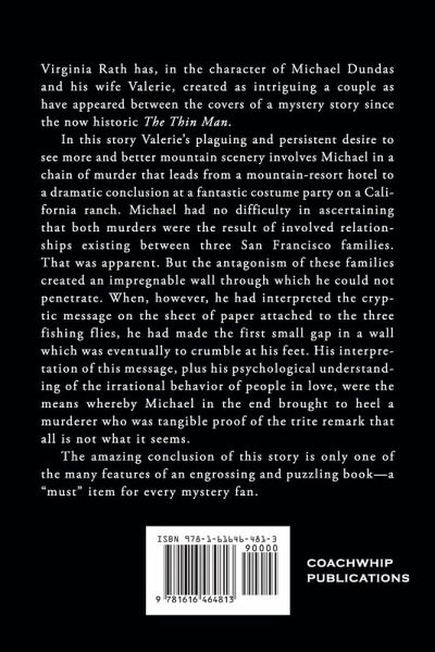 Virginia Rath has, in the character of Michael Dundas and his wife Valerie, created as intriguing a couple as have appeared between the covers of a mystery story since the now historic The Thin Man. And Death Breaks the Ring is another step upward in Mrs. Rath’s steady climb to the top of the mystery field. In this story Valerie’s plaguing and persistent desire to see more and better mountain scenery involves Michael in a chain of murder that leads from a mountain-resort hotel to a dramatic conclusion at a fantastic costume party on a California ranch. Michael had no difficulty in ascertaining that both murders were the result of involved relationships existing between three San Francisco families. That was apparent. But the antagonism of these families created an impregnable wall through which he could not penetrate. When, however, he had interpreted the cryptic message on the sheet of paper attached to the three fishing flies, he had made the first small gap in a wall which was eventually to crumble at his feet. His interpretation of this message, plus his psychological understanding of the irrational behavior of people in love, were the means whereby Michael in the end brought to heel a murderer who was tangible proof of the trite remark that all is not what it seems. The amazing conclusion of this story is only one of the many features of an engrossing and puzzling book—a "must" item for every mystery fan. Death Breaks the Ring was published in 1941. For more classic detective fiction, visit CoachwhipBooks.com.