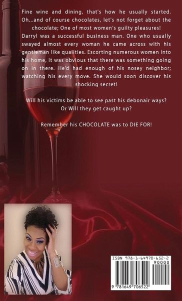 You will not want to put this edge of the seat suspense filled tone down! Fine wine and dining, that's how he usually started. Oh...and of course chocolates, let's not forget about the chocolate; One of women's most guilty pleasures! Darryl was a successful business man. One who usually swayed every woman that he came across with his gentleman like qualities.Escorting numerous women into his home, it was obvious that something was going on in there. He'd had enough of his nosey neighbor; watching his every move. She would soon discover his shocking secret! Will his victims be able to see past his debonair ways? Or will they get caught up? Remember his CHOCOLATE was to DIE FOR! The suspense will keep you up reading into the wee hours of the night.