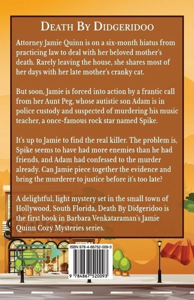 Attorney Jamie Quinn is on a six-month hiatus from practicing law to deal with her beloved mother's death. Rarely leaving the house, she shares most of her days with her late mother's cranky cat. But soon, Jamie is forced into action by a frantic call from her Aunt Peg, whose autistic son Adam is in police custody and suspected of murdering his music teacher, a once-famous rock star named Spike. It's up to Jamie to find the real killer. The problem is, Spike seems to have had more enemies than he had friends, and Adam had confessed to the murder already. Can Jamie piece together the evidence and bring the murderer to justice before it's too late? A delightful, light mystery set in the small town of Hollywood, South Florida, Death By Didgeridoo is the first book in Barbara Venkataraman's Jamie Quinn Cozy Mysteries series.