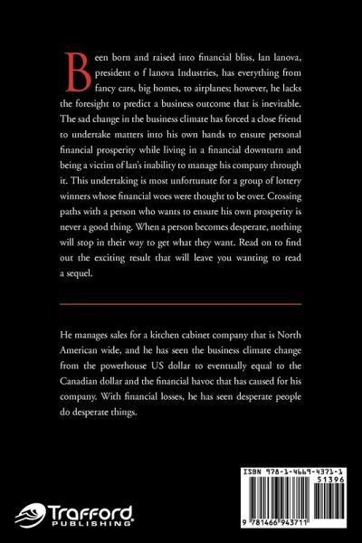 Been born and raised into financial bliss, lan lanova, president o f lanova Industries, has everything from fancy cars, big homes, to airplanes; however, he lacks the foresight to predict a business outcome that is inevitable. The sad change in the business climate has forced a close friend to undertake matters into his own hands to ensure personal financial prosperity while living in a financial downturn and being a victim of lan's inability to manage his company through it. This undertaking is most unfortunate for a group of lottery winners whose financial woes were thought to be over. Crossing paths with a person who wants to ensure his own prosperity is never a good thing. When a person becomes desperate, nothing will stop in their way to get what they want. Read on to find out the exciting result that will leave you wanting to read a sequel.