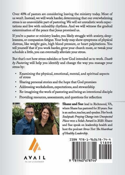 Over 40% of pastors are considering leaving the ministry today. Most of us won't. Instead, we will work harder, determining that our overwhelming stress is an unavoidable part of pastoring. We will set unrealistic work expectations and live with unhealthy rhythms. And we will witness the gradual extermination of the peace that Jesus promised us. If you're a pastor or ministry leader, you likely struggle with anxiety, sleeplessness, or compassion fatigue. Your body may show symptoms of physical distress, like weight gain, high blood pressure, or heart palpitations. You tell yourself that if you work harder, grow your church more, or tweak your schedule a little, you can eventually alleviate your stress. But that's not how stress subsides or how God intended us to work. Death by Pastoring will help you identify and change the way you manage your stress by: ¿Examining the physical, emotional, mental, and spiritual aspects of stress¿Sharing personal stories and the hope that God promises¿Addressing workaholism, expectations, and stewardship¿Re-imagining the work of pastoring and being an intentional disciple¿Providing resources, assessments, and questions for reflection