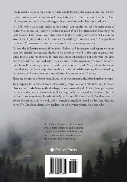 I wade waist-deep into the ocean to reach a body floating face down in the local harbor. Police, first responders, and onlookers quietly watch from the shoreline, but blood splotches and marks in the sand suggest that something awful has happened here. In 1981, while practicing medicine in a small community on the southern coast of British Columbia, Dr. Robert Crossland is asked if he'd be interested in becoming the local coroner. Like many, Robert has thrilled to the crusading adventures of TV coroner Wojeck and Quincy, M.E., so he takes up the challenge. But soon he is to find just how far these TV programs are from the real world of a community coroner. During the following twenty-three years, Robert will investigate and report on more than 600 sudden, unexpected deaths in his community and in the surrounding ocean, lakes, forests, and mountains. In each case, he must establish not only who has died but when, where, how, and why. As a member of the community himself, he often finds himself personally connected with those who have died. Many of the deaths are natural, of course, but a surprising number are exceptional due to complicated, startling, unforeseen, and sometimes even astonishing circumstances and findings. These are the stories of more than a hundred of these remarkable, often horrifying events. They happen in homes, at work sites, during recreation, or while travelling in boats, planes, or on roads. Some of the deaths prove controversial and Dr. Crossland participates in inquests that lead to changes in policies or procedures that reduce the risk of further deaths ... or sometimes, heartbreakingly, make no difference at all. Sudden death is always disturbing and in vivid, pithy, engaging anecdotes based on his case files and notes, Dr. Crossland shares with readers, the who, when, where, how, and why.