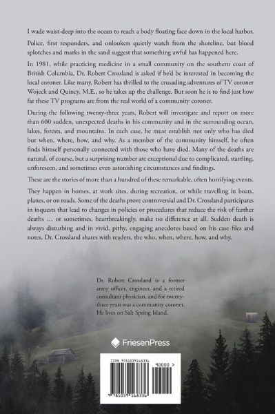 I wade waist-deep into the ocean to reach a body floating face down in the local harbor. Police, first responders, and onlookers quietly watch from the shoreline, but blood splotches and marks in the sand suggest that something awful has happened here. In 1981, while practicing medicine in a small community on the southern coast of British Columbia, Dr. Robert Crossland is asked if he'd be interested in becoming the local coroner. Like many, Robert has thrilled to the crusading adventures of TV coroner Wojeck and Quincy, M.E., so he takes up the challenge. But soon he is to find just how far these TV programs are from the real world of a community coroner. During the following twenty-three years, Robert will investigate and report on more than 600 sudden, unexpected deaths in his community and in the surrounding ocean, lakes, forests, and mountains. In each case, he must establish not only who has died but when, where, how, and why. As a member of the community himself, he often finds himself personally connected with those who have died. Many of the deaths are natural, of course, but a surprising number are exceptional due to complicated, startling, unforeseen, and sometimes even astonishing circumstances and findings. These are the stories of more than a hundred of these remarkable, often horrifying events. They happen in homes, at work sites, during recreation, or while travelling in boats, planes, or on roads. Some of the deaths prove controversial and Dr. Crossland participates in inquests that lead to changes in policies or procedures that reduce the risk of further deaths ... or sometimes, heartbreakingly, make no difference at all. Sudden death is always disturbing and in vivid, pithy, engaging anecdotes based on his case files and notes, Dr. Crossland shares with readers, the who, when, where, how, and why.