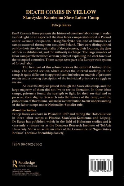 Death Comes in Yellow" presents the history of one slave labor camp in order to shed light on all aspects of the slave labor camps established in Poland under German occupation. Hasag-Skarzysko was one of hundreds of camps scattered throughout occupied Poland. They were distinguished by size, the nationality of the prisoners, their location, the date of their establishment, and the authority in charge. The large number of labor camps reflected the German policy of exploiting the work forces of the occupied countries. These camps were part of a Europe-wide system of forced labor. The first part of this volume reviews the external history of the camp. The second section, which studies the internal workings of the camp, is quite different in approach and includes an analysis of prisoner society and a moving description of the individual prisoner's struggle to survive.