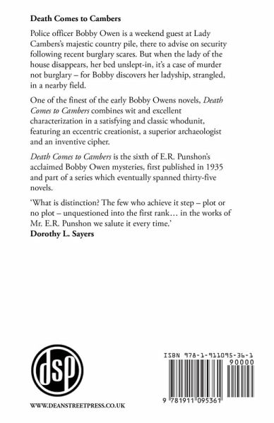 Police officer Bobby Owen is a weekend guest at Lady Cambers’s majestic country pile, there to advise on security following recent burglary scares. But when the lady of the house disappears, her bed unslept-in, it’s a case of murder not burglary – for Bobby discovers her ladyship, strangled, in a nearby field. One of the finest of the early Bobby Owens novels, Death Comes to Cambers combines wit and excellent characterization in a satisfying and classic whodunit, featuring an eccentric creationist, a superior archaeologist and an inventive cipher. Death Comes to Cambers is the sixth of E.R. Punshon’s acclaimed Bobby Owen mysteries, first published in 1935 and part of a series which eventually spanned thirty-five novels. "What is distinction? The few who achieve it step – plot or no plot – unquestioned into the first rank… in the works of Mr. E.R. Punshon we salute it every time." Dorothy L. Sayers