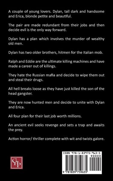 A young romantic couple working in a theatre production are made redundant. Dylan tall dark and handsome Erica petite, blonde and beautiful. Dylan has a plan to murder wealthy single old men with heart conditions. Dylan has two older brothers working for the Italian mob as hitmen. Ralph and Eddie are legends as being the ultimate killers. Dylan leaves Erica to work as a driver for his brother's, whilst Erica deceives a victim. Dylan is informed he must meet the Italian mafia boss for an initiation test before he can work for them. Ralph and Eddie dislike Russians and when a drugs deal is taking place they decide to kill them all and steal the drugs. The Russian mafia swears vengeance as they have killed the son of a leading gang member. All hell breaks loose as the Italian mob are outgunned and become hunted men. Ralph and Eddie unite with Dylan and Erica for one last job worth millions. The evil they have committed comes back to haunt them and an ancient evil begins to stalk them seeking vengeance. An epic, addictive and entertaining story complete with action, wit and horror beyond imagination.