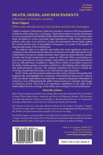 Clignet's analysis of inheritance patterns in modern America is the first sustained treatment of the subject by a sociologist. Clignet shows that even today inheritance serves to perpetuate both familial wealth and familial relations. He examines what leads decedents to chose particular legal instruments (wills, trusts, insurance policies, gifts inter vivos) and how, in turn, the instrument chosen helps explain the extent and the form of inequalities in bequests, of a result of the gender or matrimonial status of the beneficiaries. The author's major is to identify and explain the most significant sources of variations in the amount and the direction of transfers of wealth after death in the United States. He uses two kinds of primary data: estate tax returns filed by a sample of male and female beneficiaries to estates in 1920 and 1944, representing two successive generations of estate transfers, and publicly recorded legal instruments such as wills and trusts. In addition, Clignet draws widely on secondary sources in the fields of anthropology, economics, and history. His findings reflect substantive and methodological concerns. The analysis underlines the need to rethink the sociology of generational bonds, as it is informed by age and gender. Death, Deeds, and Descendants underscores the variety of forms of inequality that bequests take and highlights the complexity of interrelations between the cultures of the decedents' nationalities and issues like occupation and gender. Inheritance is viewed as a way of illuminating the subtle tensions between continuity and change in American society. This book is an important contribution to the study of the relationship between sociology of the family and sociology of social stratification.