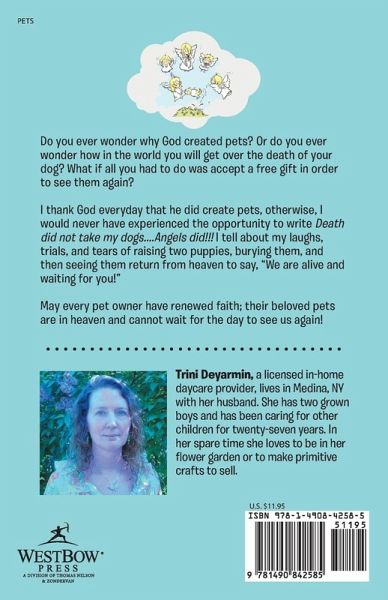 Do you ever wonder why God created pets? Or do you ever wonder how in the world you will get over the death of your dog? What if all you had to do was accept a free gift in order to see them again? I thank God everyday that he did create pets, otherwise, I would never have experienced the opportunity to write Death did not take my dogs....Angels did!!! I tell about my laughs, trials, and tears of raising two puppies, burying them, and then seeing them return from heaven to say, "We are alive and waiting for you!" May every pet owner have renewed faith; their beloved pets are in heaven and cannot wait for the day to see us again!