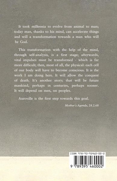 It took millennia to evolve from animal to man; today man, thanks to his mind, can accelerate things and will a transformation towards a man who will be God. This transformation with the help of the mind, through self-analysis, is a first stage; afterwards, vital impulses must be transformed - which is far more difficult; then, most of all, the physical: each cell of our body will have to become conscious. It is the work I am doing here. It will allow the conquest of death. It's another story; that will be future mankind, perhaps in centuries, perhaps sooner. It will depend on men, on peoples. Auroville is the first step towards this goal. Mother's talks on death and her views on how to deal with death are helpful and often plain and simple. Others are mind blowing: how she advises us and how she deals with this subject, we often decide not to discuss. "But people are so ignorant! They make such a fuss over death, as if it were the end - this word 'death' is so absurd! I see it as simply passing from one house into another or from one room to another; you take one simple step, you cross the threshold, and there you are on the other side - and then you come back." Death is a continuous challenge to human beings. It hovers as a threat over man's head, as at any time the fateful moment can arrive. The quest for immortality has therefore always been a major spur to man's creative aspiration, be it in arts, literature, politics or warfare. To gain immortal fame as an artist, a writer, a statesman or a conqueror, to engrave one's memory in the annals of fate, has always been and still is a tremendous motivation for mankind.